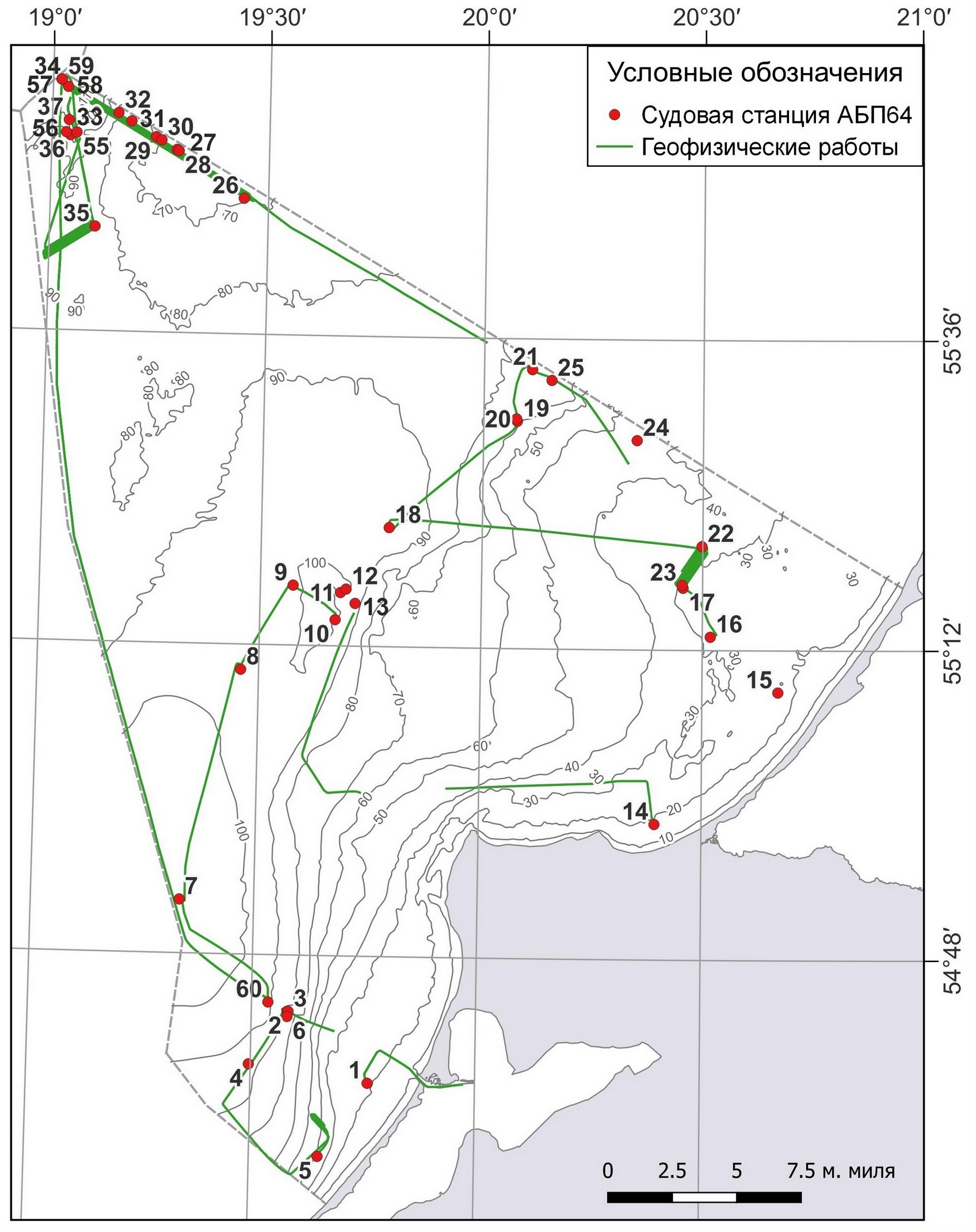 В рамках партнерства с Балтийским федеральным университетом им. И. Канта (Калининград) были продолжены комплексные океанологические исследования на морской площадке карбонового полигона «Росянка», расположенной на юго-восточном склоне Гданьской впадины. В Финском заливе по договору о сотрудничестве с Всероссийским научно-исследовательским геологическим институтом им. А.П. Карпинского (Санкт-Петербург) были выполнены геолого-геофизические работы. По договору о сотрудничестве с ООО «Фертоинг» (Санкт-Петербург) в обоих районах проведен поиск подводных объектов морского культурного наследия.